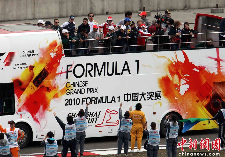 4月18日下午,2010國(guó)際汽聯(lián)F1世界錦標(biāo)賽上海站在上海國(guó)際賽車場(chǎng)舉行正式比賽,賽前24名參賽車手按照慣例乘坐敞篷車環(huán)繞賽場(chǎng)一周與車迷見面,但是寥寥無幾的觀眾與陰沉的天氣使上海F1賽事創(chuàng)下開賽七年以來觀眾人數(shù)最低的紀(jì)錄。中新社記者 任晨鳴 攝