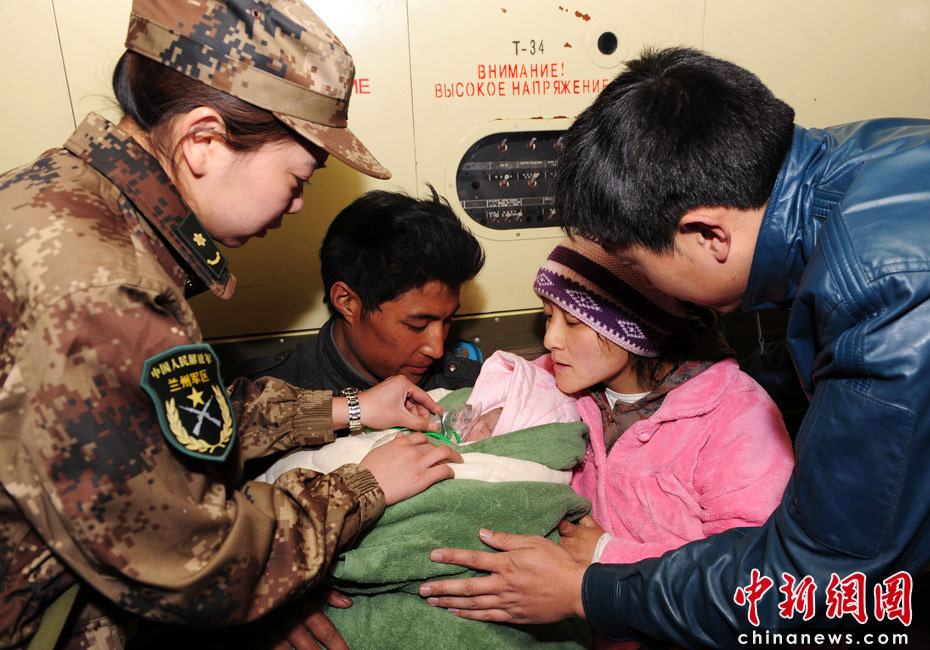 4月18日上午9點(diǎn)10分,剛剛到達(dá)玉樹(shù)機(jī)場(chǎng)正在卸下救災(zāi)物資的廣空運(yùn)輸航空兵某師劉軍機(jī)組,聽(tīng)說(shuō)有名早產(chǎn)兒急需轉(zhuǎn)送蘭州軍區(qū)總醫(yī)院救治,僅用15分鐘準(zhǔn)備,9點(diǎn)25分飛機(jī)提前起飛。懷孕8個(gè)多月藏族婦女尼瑪拉毛,由于地震驚嚇導(dǎo)致早產(chǎn)。當(dāng)日凌晨4點(diǎn)轉(zhuǎn)院途中,在蘭州軍區(qū)323醫(yī)院婦產(chǎn)醫(yī)生王小特、盧小娟的幫助下,產(chǎn)下一男嬰。由于早產(chǎn)、產(chǎn)程長(zhǎng),嬰兒嚴(yán)重缺氧,發(fā)生紫疳,為了盡快挽救嬰兒生命,準(zhǔn)備轉(zhuǎn)往蘭州軍區(qū)總醫(yī)院。圖為蘭州軍區(qū)323醫(yī)院救護(hù)隊(duì)員隨機(jī)救護(hù)。中新社發(fā) 沈玲 攝