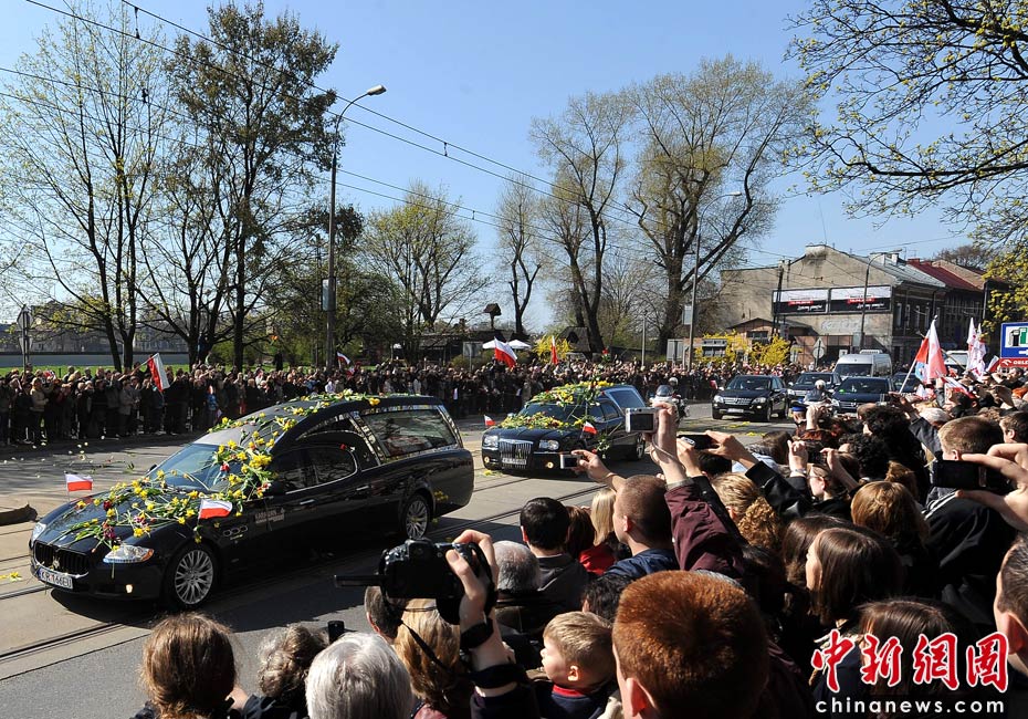當(dāng)?shù)貢r(shí)間4月18日,卡欽斯基夫婦的葬禮在波蘭南部城市克拉科夫舉行。波蘭總統(tǒng)卡欽斯基及其夫人乘坐的專機(jī)10日在俄羅斯斯摩棱斯克失事,機(jī)上人員全部遇難。圖片來源:中國(guó)新聞網(wǎng)