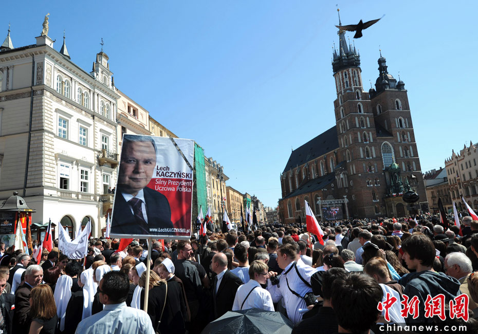 當(dāng)?shù)貢r間4月18日,卡欽斯基夫婦的葬禮在波蘭南部城市克拉科夫舉行。波蘭總統(tǒng)卡欽斯基及其夫人乘坐的專機10日在俄羅斯斯摩棱斯克失事,機上人員全部遇難。圖片來源:中國新聞網(wǎng)