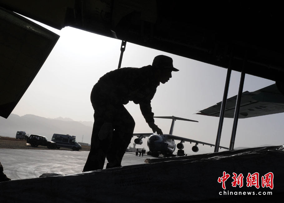 中國(guó)士兵正在空軍伊爾76重型運(yùn)輸機(jī)上搬下救災(zāi)帳篷,4月中旬以來他們連日在青海玉樹機(jī)場(chǎng)進(jìn)行抗震救災(zāi)工作。中新社發(fā) 賈國(guó)榮 攝