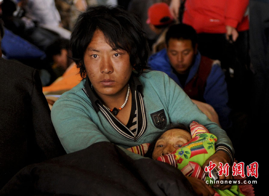 4月19日,從玉樹地震災區(qū)飛往西寧的空軍運輸機上,兒子緊擁母親前往西寧轉(zhuǎn)診。中新社發(fā) 廖攀 攝