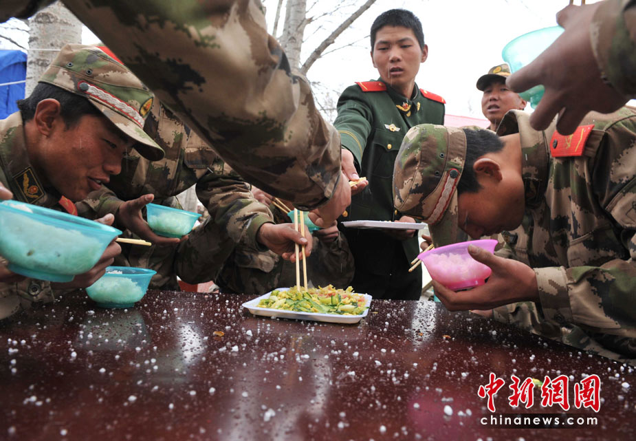 4月20日中午時分,玉樹地震災(zāi)區(qū)突然雷雹交加,正在現(xiàn)場救援的青海武警總隊官兵只能在冰雹中吃午餐。中新社發(fā) 賈國榮 攝