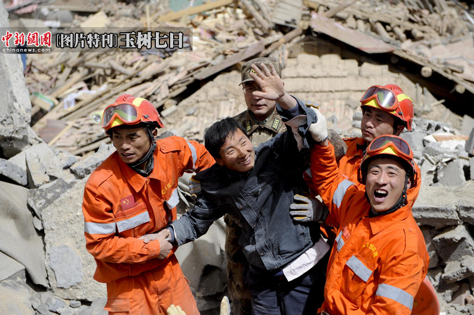 4月15日12時(shí),中國(guó)國(guó)際地震救援隊(duì)在青海玉樹縣結(jié)古鎮(zhèn)西北牛賓館廢墟上救出了四名幸存者,其間經(jīng)歷了三次余震。中新社發(fā) 廖攀 攝
