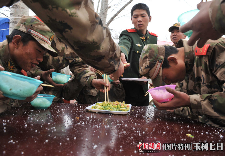 4月20日中午時(shí)分,玉樹地震災(zāi)區(qū)突然雷雹交加,正在現(xiàn)場救援的青海武警總隊(duì)官兵只能在冰雹中吃午餐。中新社發(fā) 賈國榮 攝