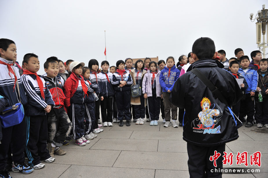 4月21日清晨,廊坊第十二小學(xué)的小學(xué)生來到天安門廣場朗讀自己的作文悼念青海玉樹地震的遇難同胞。中新網(wǎng)記者 金碩 攝