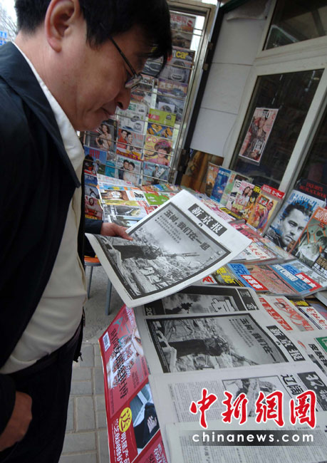 4月21日,按照中國(guó)國(guó)務(wù)院決定,舉行全國(guó)哀悼活動(dòng),全國(guó)和駐外使領(lǐng)館下半旗志哀,停止公共娛樂(lè)活動(dòng)。當(dāng)日北京各家報(bào)社刊出悼念玉樹(shù)地震遇難同胞特刊,并撤銷(xiāo)了一切彩色圖片和字頭,采用黑白版面。中新社發(fā) 鄒憲 攝