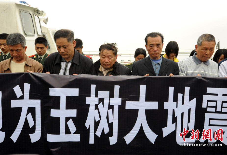 4月21日上午,福州邊防支隊馬尾大隊公邊艇警笛長鳴,百余名邊防官兵與駐地閩安中學(xué)師生、僑胞、臺胞手持黃菊花、胸戴小白花,肅立默哀3分鐘,以表達(dá)對青海省玉樹縣地震遇難同胞的深切哀悼。圖為參加該悼念儀式的福建僑胞臺胞手舉橫幅向玉樹地震遇難者默哀。中新社發(fā) 劉可耕 攝
