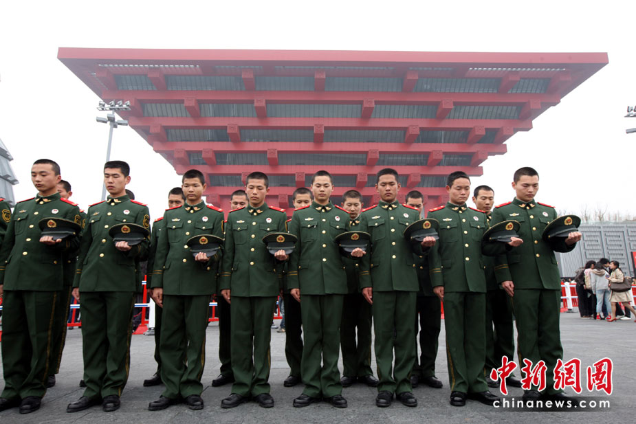 4月21日,上海世博園中國館前,負(fù)責(zé)警衛(wèi)工作的武警官兵向玉樹災(zāi)區(qū)遇難同胞肅立默哀。當(dāng)日,全國舉行哀悼活動,深切哀悼青海玉樹地震遇難同胞。 中新社發(fā) 張雷 攝