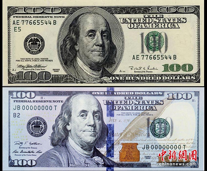 4月21日,美國(guó)財(cái)政部和美聯(lián)儲(chǔ)共同發(fā)布新版100美元面值的紙幣票樣。此次發(fā)行新版百元美鈔旨在防范假鈔,同時(shí),老版美元仍將繼續(xù)流通。圖片來源:中國(guó)新聞網(wǎng)