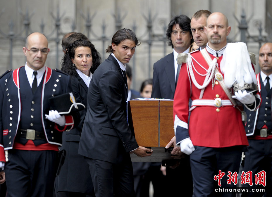 西班牙當(dāng)?shù)貢r(shí)間4月22日18時(shí),國(guó)際奧委會(huì)終身名譽(yù)主席薩馬蘭奇的葬禮在巴塞羅那舉行,包括西班牙國(guó)王夫婦、現(xiàn)任國(guó)際奧委會(huì)主席羅格、F1車手阿隆索、巴薩俱樂(lè)部主席等在內(nèi)的政界和體育界4000多人出席,網(wǎng)球名將納達(dá)爾等負(fù)責(zé)抬靈柩,送別薩翁最后一程。 圖為西班牙網(wǎng)球明星納達(dá)爾忍悲痛抬棺木。