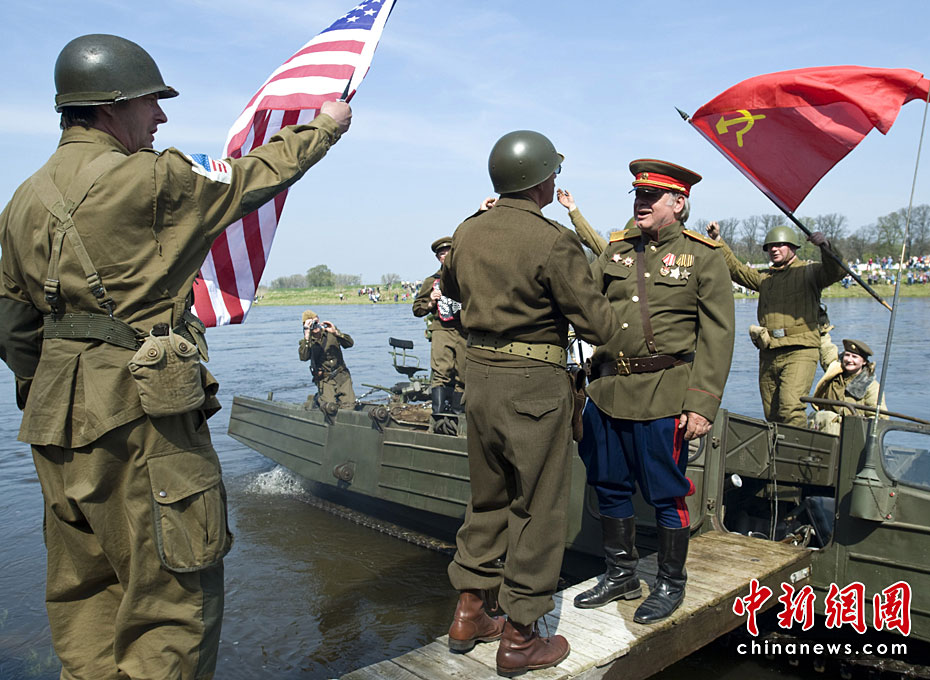 德國當(dāng)?shù)貢r(shí)間4月24日,演員身著二戰(zhàn)時(shí)期美蘇軍裝在德國托爾高南部易北河畔的一座小橋上重現(xiàn)當(dāng)年的“會(huì)師”一幕。