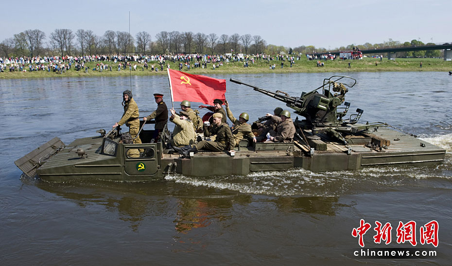 德國當(dāng)?shù)貢r(shí)間4月24日,演員身著二戰(zhàn)時(shí)期美蘇軍裝在德國托爾高南部易北河畔的一座小橋上重現(xiàn)當(dāng)年的“會(huì)師”一幕。
