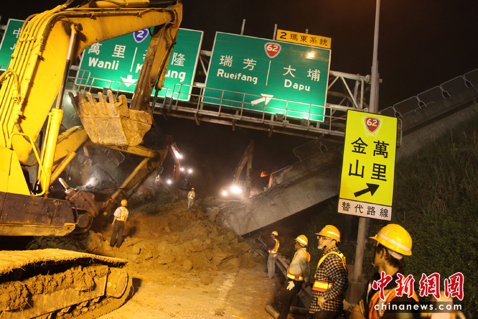 4月25日, 臺(tái)灣一條交通要道、“北二高”基隆段發(fā)生山崩意外,傾瀉而下的土石壓垮一座高架橋,并覆蓋道路約200米,據(jù)傳有人車被埋。圖為工程人員連夜開挖,展開大搜救。 中新社發(fā) 董會(huì)峰 攝