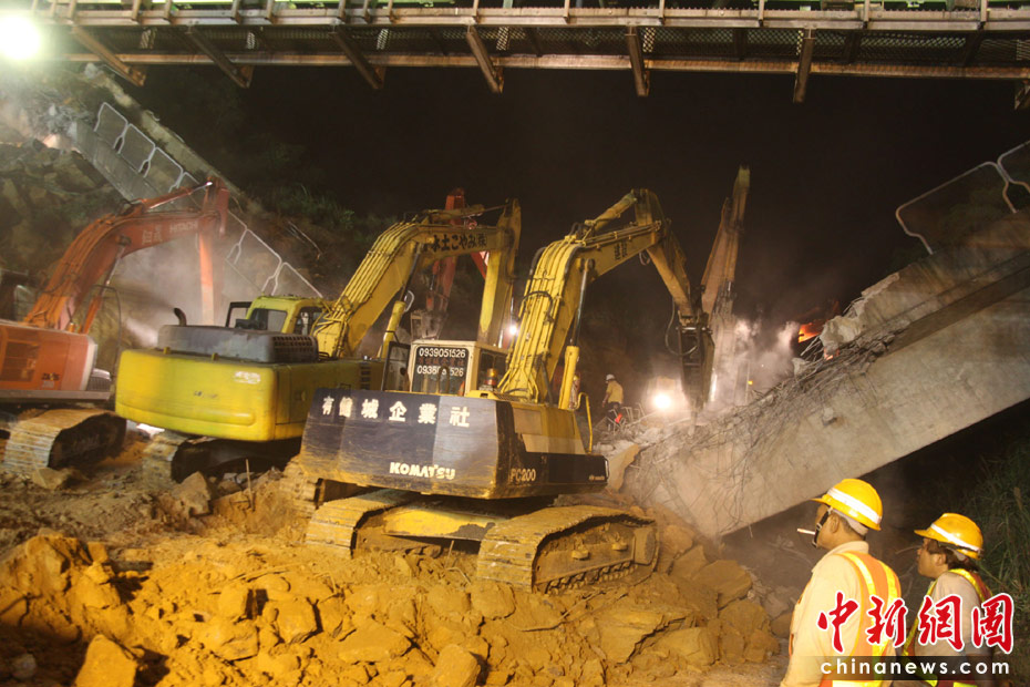 4月25日, 臺灣一條交通要道、“北二高”基隆段發(fā)生山崩意外,傾瀉而下的土石壓垮一座高架橋,并覆蓋道路約200米,據(jù)傳有人車被埋。圖為工程人員連夜開挖,展開大搜救。 中新社發(fā) 董會峰 攝