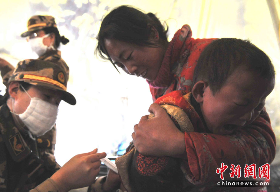 武警青?傟(duì)玉樹(shù)支隊(duì)是最先投入抗震救災(zāi)的先鋒部隊(duì),地震發(fā)生時(shí)恰逢部隊(duì)出操,營(yíng)房嚴(yán)重受損而官兵平安無(wú)恙。這里立即成為抗震救災(zāi)的軍民和媒體的大本營(yíng)之一,醫(yī)療救護(hù)隊(duì)和新型炊事車晝夜為軍民服務(wù)。集結(jié)在地震災(zāi)區(qū)的各路部隊(duì)從4月低之前全面轉(zhuǎn)入安置群眾和災(zāi)后重建,這里的的后勤已經(jīng)得到基本保障。 圖為醫(yī)療隊(duì)軍醫(yī)為受災(zāi)民眾治療。 中新社記者 賈國(guó)榮 攝