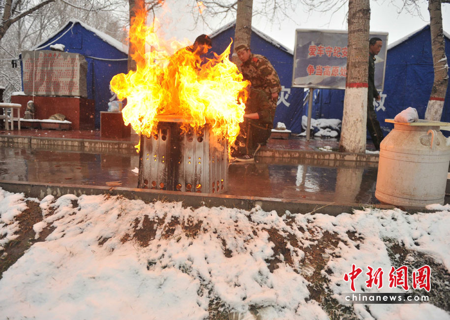 武警青?傟(duì)玉樹支隊(duì)是最先投入抗震救災(zāi)的先鋒部隊(duì),地震發(fā)生時(shí)恰逢部隊(duì)出操,營房嚴(yán)重受損而官兵平安無恙。這里立即成為抗震救災(zāi)的軍民和媒體的大本營之一,醫(yī)療救護(hù)隊(duì)和新型炊事車晝夜為軍民服務(wù)。集結(jié)在地震災(zāi)區(qū)的各路部隊(duì)從4月低之前全面轉(zhuǎn)入安置群眾和災(zāi)后重建,這里的的后勤已經(jīng)得到基本保障。 圖為武警新型炊事車?yán)脷饣癄t冒著雨雪為救援官兵和受災(zāi)民眾做飯。 中新社記者 賈國榮 攝
