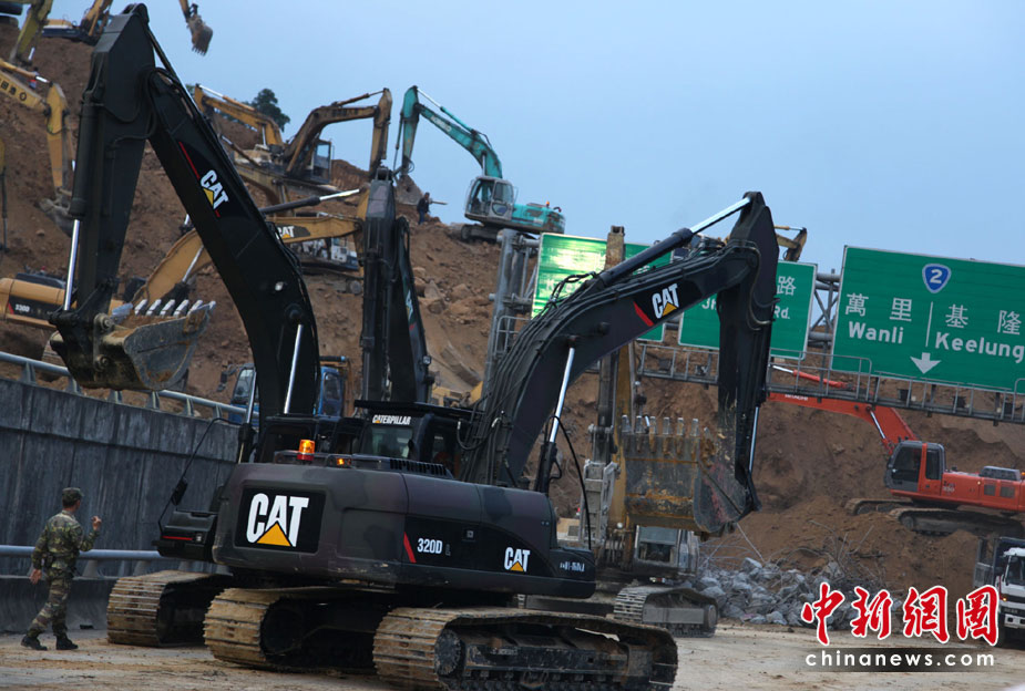 4月27日,臺(tái)灣“北二高”基隆段山體大滑坡意外第3天,開(kāi)挖搜救風(fēng)雨無(wú)阻、持續(xù)進(jìn)行,消防部門(mén)陸續(xù)接獲民眾報(bào)告,疑似5車(chē)6人被深埋,包括兩輛奔馳轎車(chē)、一對(duì)年輕情侶。圖為軍方出動(dòng)大型機(jī)械車(chē)參與挖掘工作。中新社發(fā) 董會(huì)峰 攝