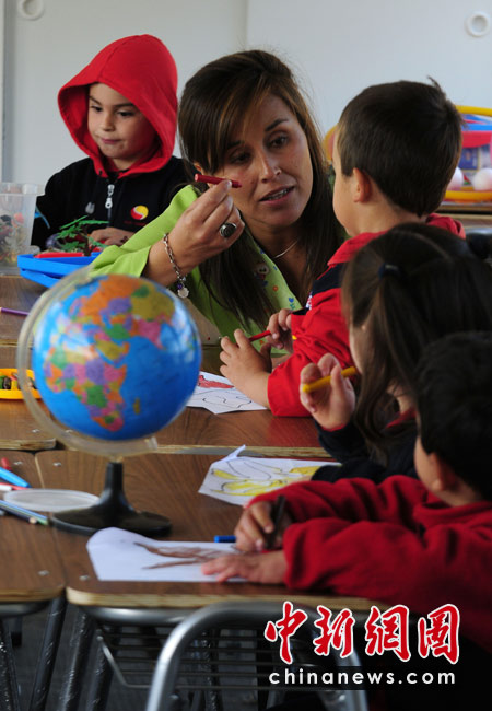4月26日,今年2月遭受8.8級強烈地震的智利康塞普西翁市,兒童們在“巴士學(xué)校”里上課。