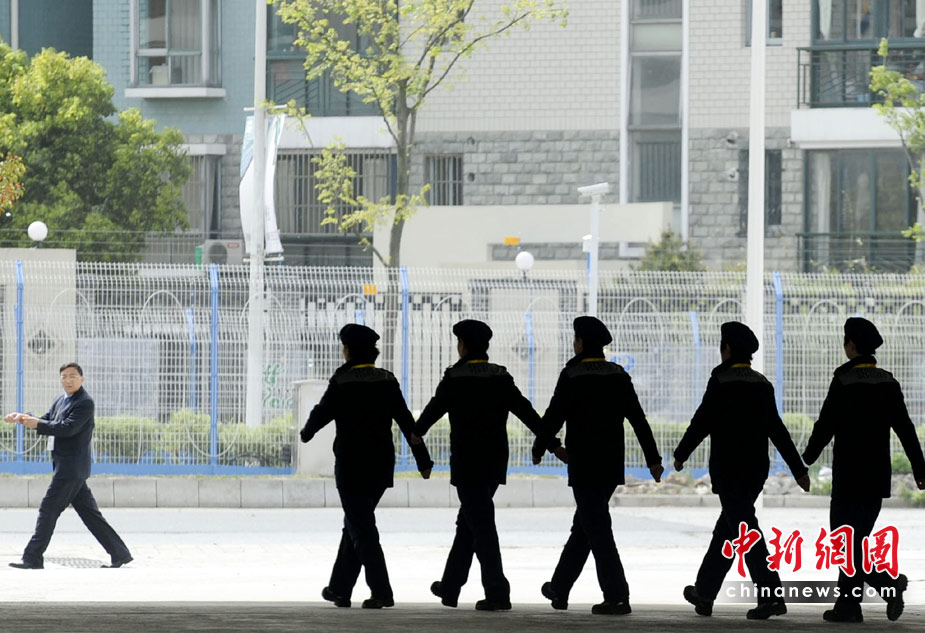 4月27日,上海世博園里一隊女性安保人員走過引起一旁的男士側(cè)目。中新社發(fā) 廖攀 攝