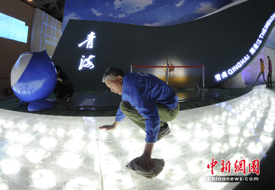 4月27日,中國(guó)省區(qū)市聯(lián)合館中的青海館,工作人員維護(hù)設(shè)施,展覽工作準(zhǔn)備就緒。中新社發(fā) 廖攀 攝