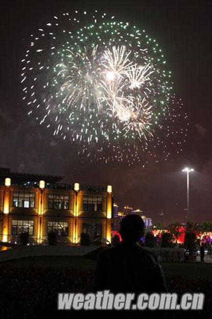 2010年4月27日,上海世博會開幕式彩排順利進(jìn)行。圖為煙花精彩,駐足觀賞。卞赟 攝