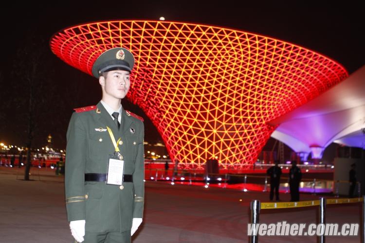 2010年4月27日,上海世博會開幕式彩排順利進行。圖為世博彩排現(xiàn)場堅守崗位的武警戰(zhàn)士。卞赟 攝(圖片來源:中國天氣網(wǎng))