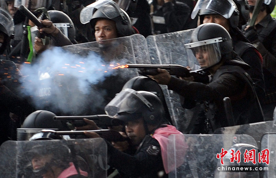 泰國防暴警察與紅衫軍示威民眾28日下午爆發(fā)沖突,1名士兵頭部被擊中身受重傷,10名示威民眾受傷送醫(yī)。