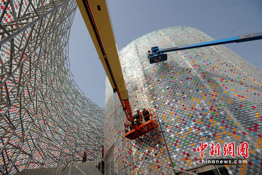 4月29日,工人在對拉脫維亞館的外墻進行美化。秦淮 攝