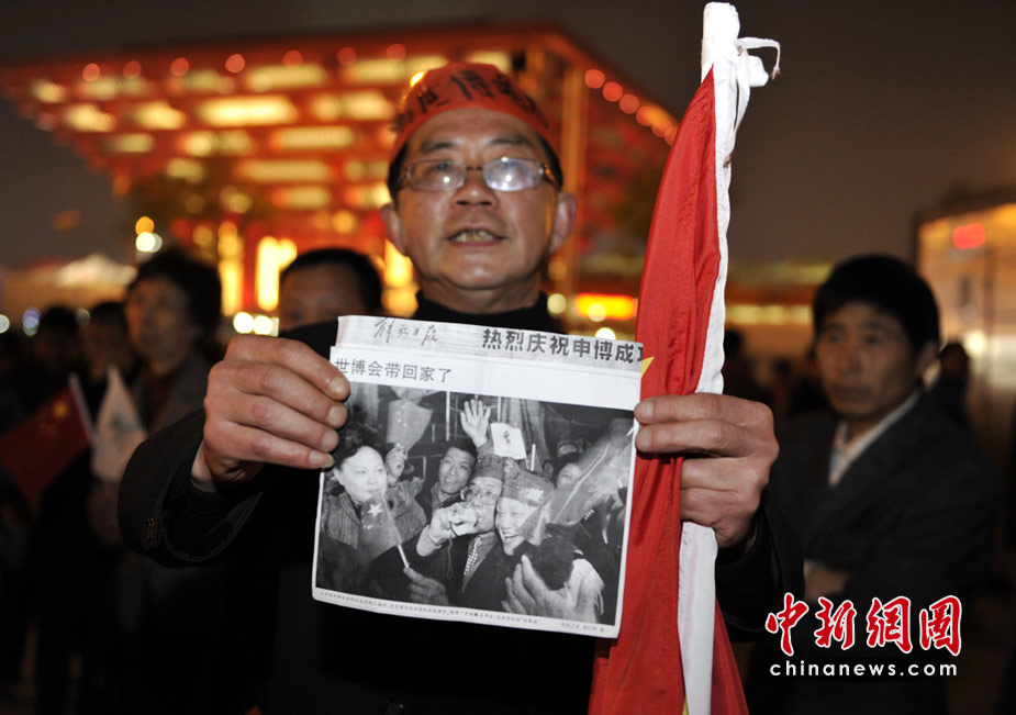30日晚上8時(shí),2010年上海世博會(huì)正式拉開帷幕。60多歲的俞大爺頭上戴著寫有“為世博喝彩!”的頭箍。他告訴記者,8年前,世博申辦成功的時(shí)候,他也曾經(jīng)戴過這樣一個(gè)頭箍,上面寫著“我們成功了!”圖為俞大爺展示8年前申博成功時(shí)報(bào)紙上登的他的照片。中新網(wǎng)記者 王紅綱 攝