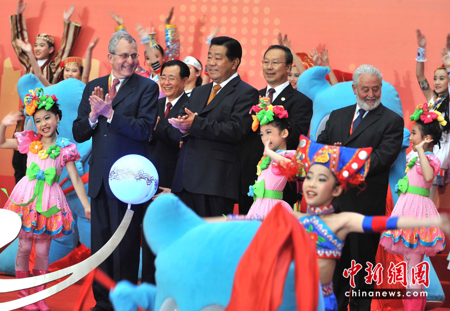 2010年上海世界博覽會開園儀式于5月1日上午舉行,全國政協(xié)主席賈慶林與國際展覽局主席藍(lán)峰共同啟動按紐。中新社發(fā) 賈國榮 攝