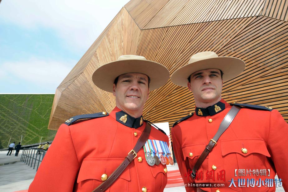 5月1日,上海世博會正式開園,當日有20萬人次的游客參觀了世博園。世博首日,許許多多的小細節(jié)都帶給人一種全新的體驗。圖為兩名加拿大騎警在加拿大館前亮相。中新社發(fā) 陳文 攝