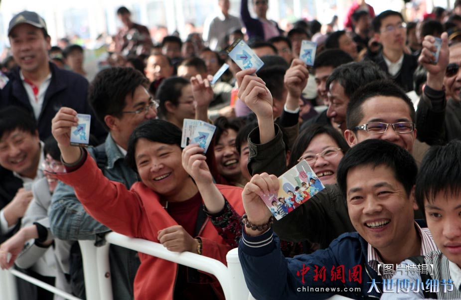 5月1日,上海世博會正式開園,當日有20萬人次的游客參觀了世博園。世博首日,許許多多的小細節(jié)都帶給人一種全新的體驗。圖為首批持票參觀者開心地展示參觀券。中新社發(fā) 袁云 攝