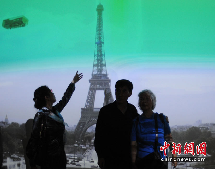 5月2日,上海世博園內,中國游客在法國館親密接觸艾菲爾鐵塔影像。中新社發(fā) 廖攀 攝