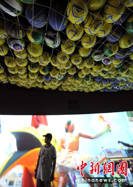 5月2日,上海世博園巴西館,一個(gè)小觀眾在播放著桑巴熱舞的環(huán)形屏幕前留影。這個(gè)放映廳的天花板是由幾千個(gè)足球組成,盡顯“桑巴王國”、“足球王國”的風(fēng)采。 中新網(wǎng)記者 王紅綱 攝