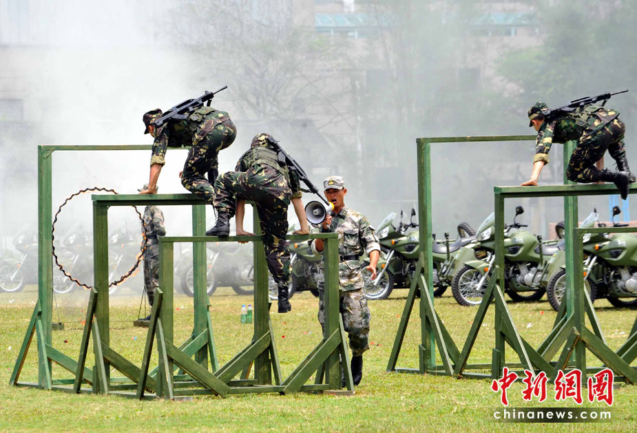 為慶!拔逡弧眹H勞動(dòng)節(jié),進(jìn)一步增進(jìn)與香港社會(huì)各界相互溝通與交流,中國人民解放軍駐香港部隊(duì)5月2日開放了石崗軍營。圖為駐港部隊(duì)精彩的表演。 中新社發(fā) 鄧慶樂 攝