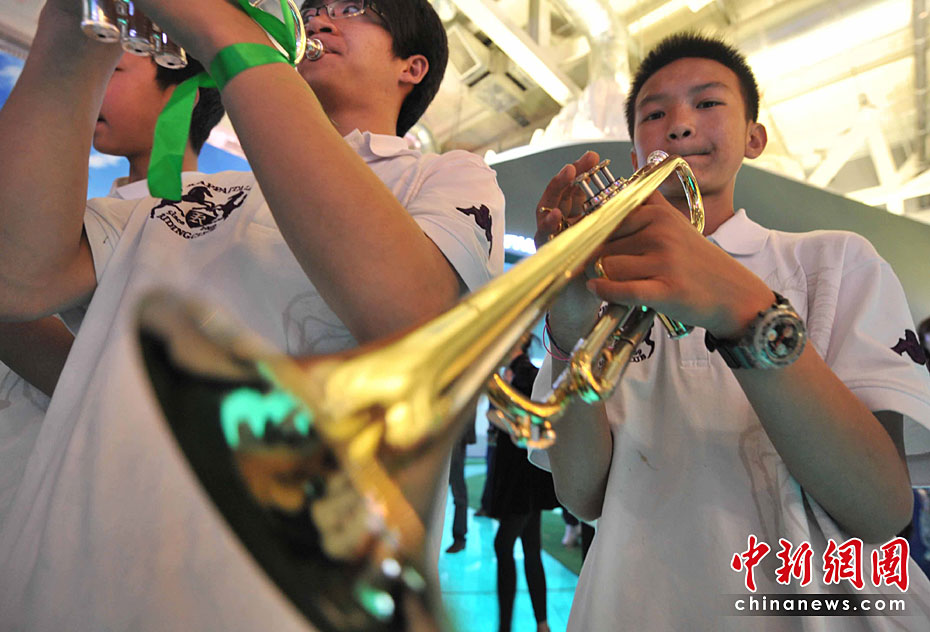 5月2日清晨,來自玉樹地震災(zāi)區(qū)結(jié)古鎮(zhèn)的藏族小樂手巴東珠,含著姐姐在地震中不幸遇難的悲痛心情,與小白楊中學(xué)生管弦樂團(tuán)來到上海世博會,為中國青海館觀眾獻(xiàn)上一曲《在那遙遠(yuǎn)的地方》。他悲歡交融的情懷和演藝,感動(dòng)全場。巴東珠之前還是青海省人民醫(yī)院為地震傷員做藏語翻譯的志愿者。中新社記者 賈國榮 攝