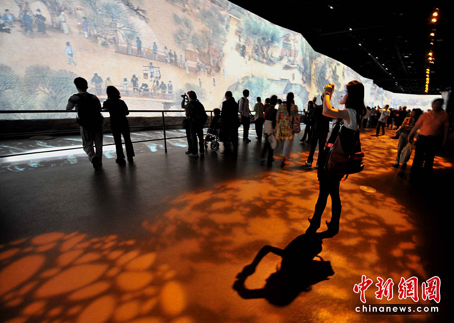 5月2日,中外觀眾依然最熱捧上海世博會中國館的“鎮(zhèn)館之寶”——巨幅放大電子動態(tài)版的北宋畫家張擇端名作《清明上河圖》。此世博版的《清明上河圖》高6.3米,長130余米,約是原圖的30倍,需要12臺電影級的投影儀同時工作。整個活動畫面以4分鐘為一個周期,盡展宋朝盛世的都市日夜風(fēng)情。中新社記者 賈國榮 攝