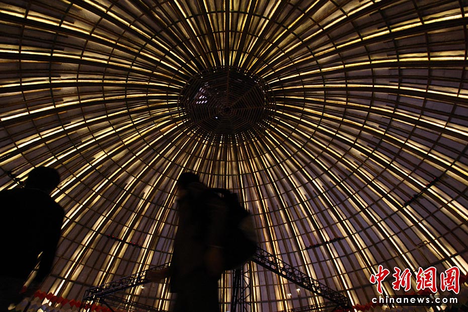 5月2日,上海世博會(huì)是第一個(gè)正式提出“低碳世博”理念的世博會(huì),圍繞著這樣的理念,上海世博園區(qū)內(nèi)的低碳元素比比皆是。圖為印度館內(nèi)竹制的世界最大穹頂,這個(gè)竹制穹頂上方是小型風(fēng)力發(fā)電裝置和太陽能電池板,為整個(gè)場館提供綠色清潔能源。中新社發(fā) 湯彥俊 攝