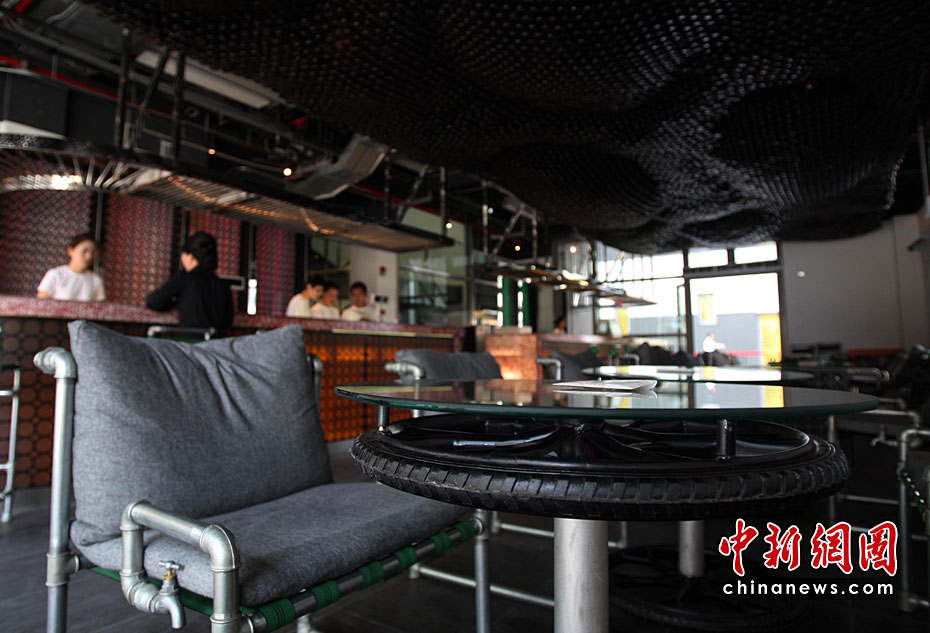 5月2日,上海世博會是第一個正式提出“低碳世博”理念的世博會,圍繞著這樣的理念,上海世博園區(qū)內的低碳元素比比皆是。圖為世博倫敦零碳館內由廢舊輪胎、水管、瓶子組成的“零碳酒吧”。中新社發(fā) 湯彥俊 攝