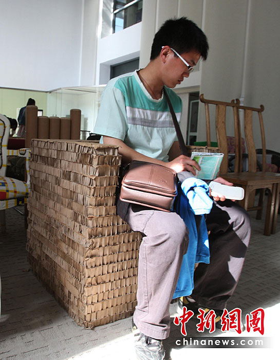 5月2日,上海世博會(huì)是第一個(gè)正式提出“低碳世博”理念的世博會(huì),圍繞著這樣的理念,上海世博園區(qū)內(nèi)的低碳元素比比皆是。圖為世博倫敦零碳館內(nèi)由廢舊紙箱做成的沙發(fā)。中新社發(fā) 湯彥俊 攝
