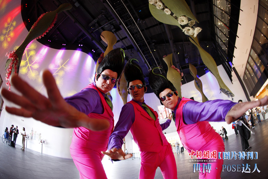 逛世博一定會拍照留念,擺一個漂亮有創(chuàng)意的pose尤為重要。面對著鏡頭,挺胸收腹翹臀,一個微笑,一個手勢,秀出自己的活力。心中一定要默念:“我留下的不是照片,是心情!”圖為“貓王”造型的澳大利亞館工作人員在記者鏡頭前擺出狂野造型。中新社記者 盛佳鵬 攝