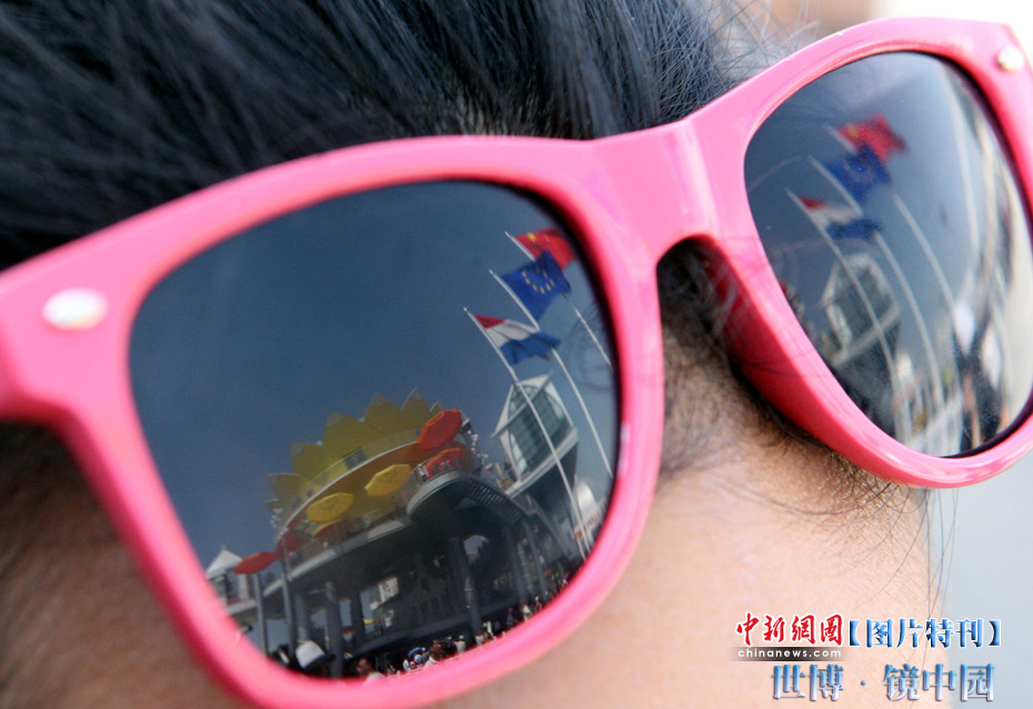 世博園開園3天,天氣一直晴熱,不少游客帶起墨鏡來遮擋刺目的陽光,從鏡片的折射中看世博園,別有一番趣味。中新社記者 湯彥俊攝