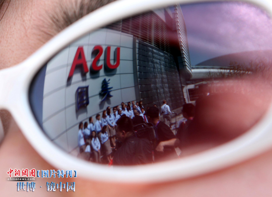 世博園開園3天,天氣一直晴熱,不少游客帶起墨鏡來遮擋刺目的陽光,從鏡片的折射中看世博園,別有一番趣味。中新社記者 湯彥俊攝