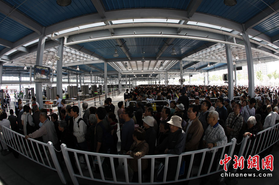 上海世博會4日迎來首個平日票的參觀客潮,圖為世博園區(qū)7號門入口外,還不到開園時(shí)間,已經(jīng)有大批游客排隊(duì)等候。中新社記者 盛佳鵬攝