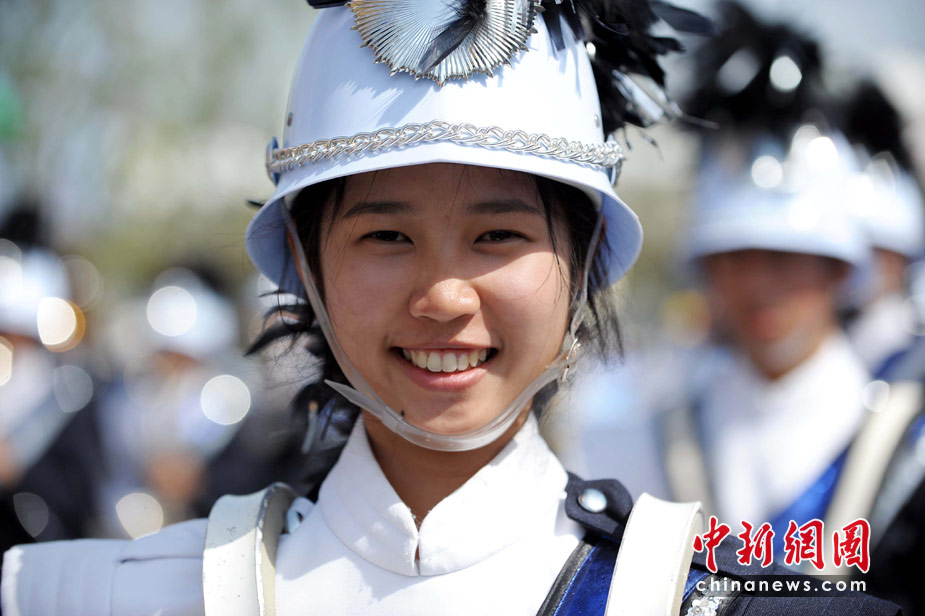 來(lái)自泰國(guó)南邦甘拉雅尼步操樂(lè)團(tuán)的美少女,在上海世博會(huì)園區(qū)舉行的“歡樂(lè)盛裝大巡游”中引人注目。中新社發(fā) 陳文 攝