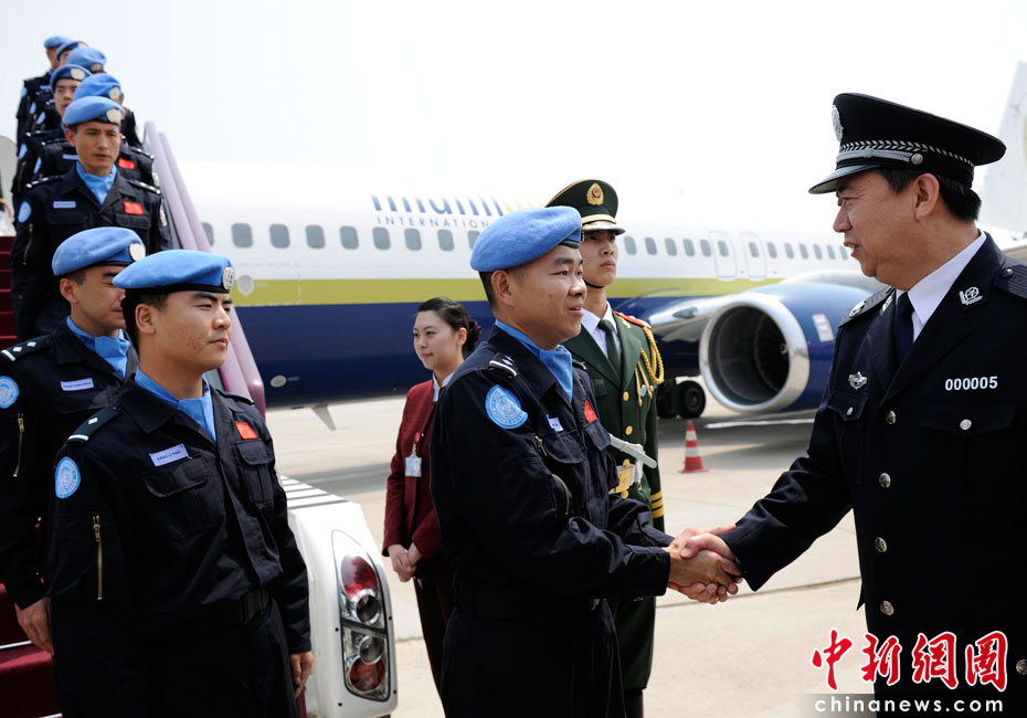 5月4日,中國(guó)第八支赴海地維和警察防暴隊(duì)全體隊(duì)員乘坐聯(lián)合國(guó)包機(jī)返回祖國(guó)。公安部副部長(zhǎng)孟宏偉、政治部主任蔡安季前往機(jī)場(chǎng)迎接。 中新社發(fā) 劉震 攝