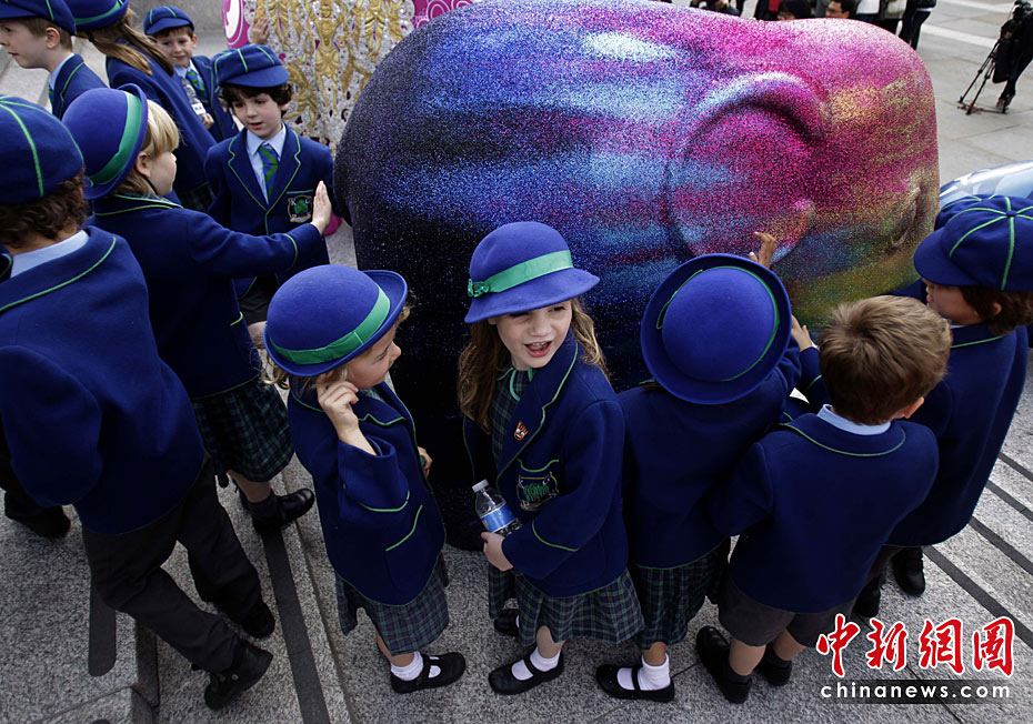 5月4日,2010年倫敦大象游行活動當日在特拉法爾加廣場啟動。260個真象大小的彩繪雕塑將在倫敦各處展出,并將于6月30日拍賣為慈善組織籌款。圖片來源:中國新聞網(wǎng)