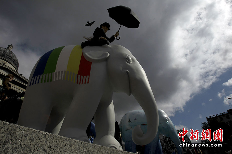 5月4日,2010年倫敦大象游行活動(dòng)當(dāng)日在特拉法爾加廣場(chǎng)啟動(dòng)。260個(gè)真象大小的彩繪雕塑將在倫敦各處展出,并將于6月30日拍賣為慈善組織籌款。圖片來源:中國新聞網(wǎng)
