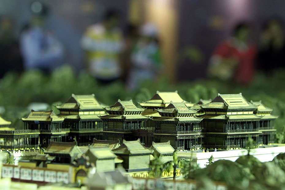 5月4日,游客在參觀縮微版“圓明園”。近日,一座“全景式巨型立雕圓明園”在上海世博會(huì)世界貿(mào)易中心協(xié)會(huì)館亮相。這座縮微版的“圓明園”以1比150的比例制作而成,再現(xiàn)了全盛時(shí)期的圓明園雄偉壯觀的全景。圖片來(lái)源:新華網(wǎng) 裴鑫 攝